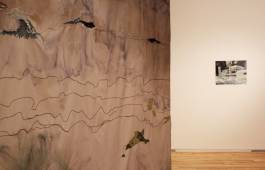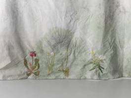 Curtain (The Year of the Whale) (2018) is a seven-metre fabric curtain that captures the view from Melsheimer’s studio. Landscape elements are alluded to rather than depicted precisely: the outline of distant hills is barely sketched in, while a single wave crests over a rocky outcrop. Indigenous plants are rendered with the exactitude of botanical specimens. A codfish and a humpback whale appear, their presence heralded not as creatures observed but to underline their historical relevance to Fogo Island and its entanglement with the sea.