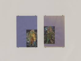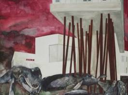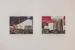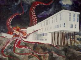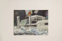 Four gouaches depict iconic buildings encroached by rising tides and massive sea creatures. Set against dramatic darkened skies, these are human structures amidst an environment that is at once threatening and enthralling: enveloped in the tentacles of a giant octopus or confronted by a massive iceberg. Two gouaches portray a half-human, half-animal figure, the artist herself, perhaps, merging with local fauna.