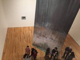 Melsheimer’s landscape evokes traditional Eastern perspective, creating a vertical sense of distance with areas left open to the imagination. The multiview-point imagery creates an embodied sense of space that is an accumulation of time and experience, conveying a feeling of the ocean and landscape, as well as the passage of time. The curtain eschews not only Western one-point perspective, but its implication of a rational, domineering gaze over the landscape.