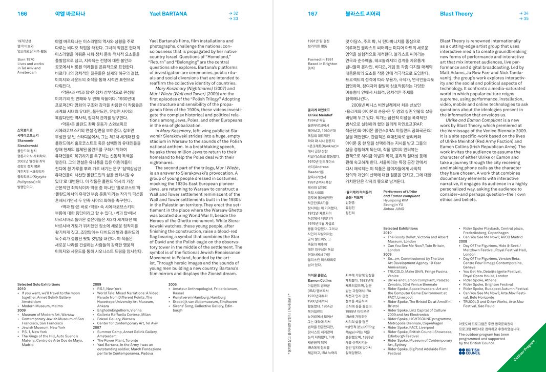 Artists: Ziad Antar, Tarek Atoui, Lucas Bambozzi/ Cao Guimarães/ Beto Magalhães, Yael Bartana, Blast Theory, Manon De Boer, Mark Bradford, Antonio Caballero, Cho Duck Hyun, Abraham Cruzvillegas, Jimmie Durham, Rainer Ganahl, Douglas Gordon, Shilpa Gupta, Izumi Taro, Adrià Julià, Annette Kelm, Kim Beom, Kim Soun Gui, Sung Hwan Kim, Koizumi Meiro, Miki Kratsman, Erik Van Lieshout, Minouk Lim, Sarah Morris, Deimantas Narkevičius, Tuấn Andrew Nguyễn, Noh Suntag, Catherine Opie, Christodoulos Panayiotou, Park Chan-Kyong, Walid Raad, Judy Radul, Jewyo Rhii, Willem De Rooij, Julika Rudelius, Tino Sehgal, Allan Sekula, Duncan Speakman, Do Ho Suh, Nasrin Tabatabai & Babak Afrassiabi, Apichatpong Weerasethakul, Xijing Men (Chen Shaoxiong/ Gimhongsok/ Tsuyoshi Ozawa), Yangachi, Tobias Zielony.