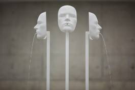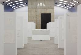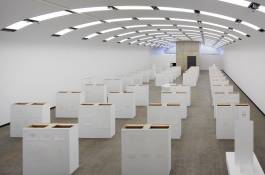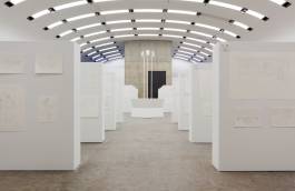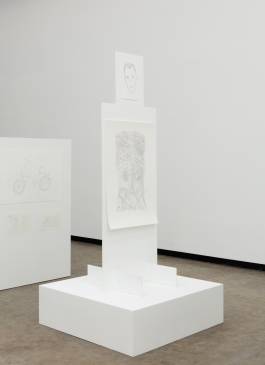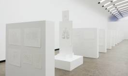 Like in a pictorial encyclopaedia, the drawings will show almost everything the modern world has to offer from maps and city views to cars, airplanes and people; from laundry bags, men’s shoes, paint buckets and restaurant interiors to chocolate mousse recipes, dog training schools, underwater worlds and cheese trays. Unlike conventional pictorial dictionaries, there is no symbolic system. Everything is exposed to everyone, so everything is equal. Furthermore the ductus of these drawings lacks any emotional, compositional or distinctive expression. In contrast, the display on which the pencil drawings are presented is organised strictly: rank and file of ordered blocks form display walls in a rectangular structure. In every corner of the exhibition space one of four White Elements serves as a guard. The three-headed fountain with its mask-like faces De Drie Wijsneuzen (cast from styrofoam heads found in a German shop window) reaches up from the middle of the formation and has an overview of the overall silent and colourless setting.