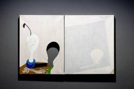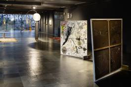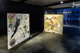 Frank’s polymorphous amalgamations of linguistic and visual art (the exhibition gathers works dating from different periods since 1963) transport the beholder into a world of ideas in which human existence, the origin and trajectory of thoughts, the body, and the inner life are central themes. What the cogwheels of everyday life, where rationalism and economic considerations reign supreme, keep neatly separate is here undivided: reason and emotion. Heinz Frank puts forwards that both are interdependent and therefore equipollent: what makes the human being human is the thought that is felt and vice versa. Hence one of his mottos: “Thinking what one feels and feeling what one thinks.” The artist makes use of the glass curtain walls at the Kunsthalle Wien Karlsplatz exhibition hall to hang double-sided painted pictures on the insides of the panes. Unframed glass is neither window nor hole, but pictures mounted on glass walls can become windows, especially when they have holes.