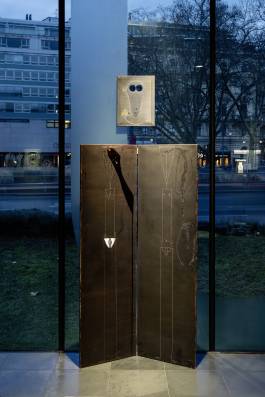 For Frank, eyeholes, usually, through which one can in this instance catch glimpses not only of the emptiness inside a head but of the exterior or interior space behind them. To put it, again, in Frank’s words: “Wall-internal embodies wall-external.” Or: “Humans are the blurred windows on the outside.” The spatial features of the exhibition space, are also brought into play, particularly the rectangular corners, where four sculptures are located on rugs. A series of painted folding-screens, by contrast, are positioned along the glass panes, standing as tall as Heinz Frank—they are angled movable walls, though they may not shield anything but themselves. the screens also each sport at least one hole, that “epitome of emptiness,” although, one should note, according to Frank: “The hole, [is] thinking’s sixth finger.” The exhibition at Kunsthalle Wien Karlsplatz reveals Heinz Frank as not only a deft performer of poetically nested conceits and sallies, but also as an architect—who is at home at the drafting table: the measure of his things, of their proportions and relations to the space around them, is always the human being—and, therefore, the artist himself as an embodied I.