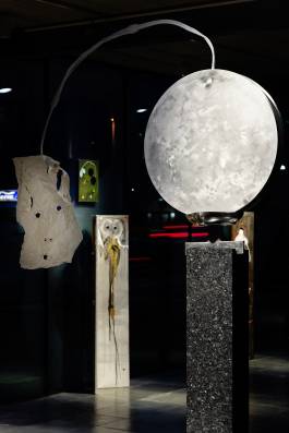 Accomplished in mobilizing multiple media, he interlaces, freely mixes and matches various materials such as: wood, stone, plaster, paint, clay, glass, metal, and found fabrics, wires, boxes, trestles, mirrors, or parts of old household appliances. Combining, assembling, and transforming these and other objects and devices, Frank probes the tensions between polar opposites such as hard and soft, hot and cold, inside and outside, heavy and light, beginning and end, pinpointing in forever novel creations how—as well as proposing that—these terms are all interconnected. To use a paradoxical formula in which the artist once summed up his objective: “Transforming the unformed into the formless.” It is always the word that lies at the beginning of his creative process—or, more specifically, an aphoristic conceit, noted by hand on a piece of paper, that now accompanies the work whose genesis it sparked. “The hole is the epitome of emptiness,” “Of the long-nosed monkey me,” or “The posterior and the anterior of the others” … we read juxtaposed beside individual pictures and sculptures. Another anthropomorphic sculpture, for its part, has: “No back of the head, for the vertex toward the funnel was born to think.”