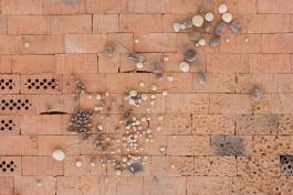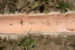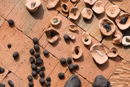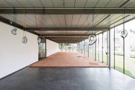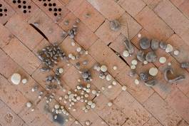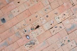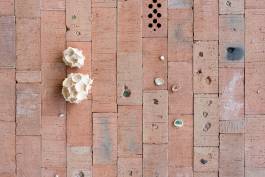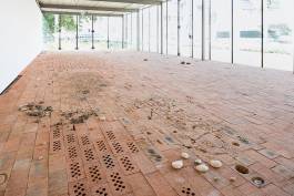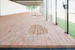 Newby makes use of bricks as artistic material in a newly created large-scale work installed on the floor in the Karlsplatz building, taking up most of the interior space. For this work, the artist modified unfired bricks and inserted found elements: shattered glass pieces left behind as a result of people spending time outdoors in the Karlsplatz area, and bits of clay collected when the subway was constructed. Through the firing process unexpected formations are produced that imprint the inserted pieces of glass and clay. Newby also adds some small, individual ceramic and bronze pieces that turn out—only upon closer inspection—to be handmade objects. The sculpture unfolds as a material texture that invites visitors to step onto the work, to move across the surface and encounter its details. Discreetly integrated into the exhibition space, the artwork allows the incoming natural light to become part of the installation, and its reflection encourages the viewers’ gaze to wander outside.