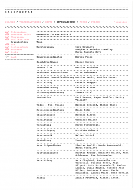 Artists: 0100101110101101.org , Halil Altindere (Turkey), Daniel García Andújar (Spain), Apsolutno (Yugoslavia), Ibon Aranberri (Spain), Olivier Bardin (France), Yael Bartana (Israel), Massimo Bartolini (Italy) •Marc Bijl (Netherlands), Pierre Bismuth (France), Bleda y Rosa (Spain), Elisabetta Benassi (Italy)• BLESS, Lionel Bovier , Luchezar Boyadjiev (Bulgaria), Fernando Bryce (Peru), Gerard Byrne (Ireland), Roberto Cuoghi (Italy), Jonas Dahlberg (Sweden), Kathy Deepwell , Dagmar Demming , Branislav Dimitrijevic, Esra Ersen, Jon Mikel Euba (Spain), Jeanne Faust (Germany), João Fernandes, Zlatan Filipovic (Sarajevo, Bosnia and Hercegovina), Finger (Berlin), Christoph Fink (Belgium), Nina Fischer & Maroan El Sani (Germany/Germany), Dirk Fleischmann (Germany) •Andreas Fogarasi (Austria), Luke Fowler (Great Britain), Andrea Geyer (Germany), Alonso Gil, Gudmundsdottir (Iceland), Alban Hajdinaj (Albania), Lise Harlev (Denmark), Institut für Kulturanthropologie und Europäische Ethnologie (Germany), Jens Hoffmann (in collaboration with Natascha Sadr Haghighian & Tino Sehgal, Takehito Koganezawa (Japan), Erden Kosova , Andreja Kuluncic (Yugoslavia), Antal Lakner (Hungary), Franck Larcade , Anton Litvin (Russia), Gintaras Makarevicius, Ján Mancuska (Slovakia), Mathieu Mercier (France), Suzana Milevska, Gianni Motti (Italy), Ivan Moudov, Oliver Musovik (Macedonia), Nina Fischer & Maroan el Sani (Germany/Germany), Olivier Nottellet, OHIO Photomagazine, Maria Papadimitriou (Greece), Florian Pumhösl (Austria), Tobias Putrih (Slovenia), Radek Group, Sal Randolph (USA), Revolver Archiv für aktuelle Kunst (Germany), Gianni Romano, ROR Revolutions on Request (Finland), rraum-rraum02-ideoblast (Germany), Pia Rönicke (Denmark) Natascha Sadr Haghighian, Hedwig Saxenhuber, Hans Schabus (Austria), Tino Seghal, Kalin Serapionov (Bulgaria), Bruno Serralongue (France), Erzen Shkololli, Sancho Silva (Portugal), Monika Sosnowska (Poland), Laura Stasíulytë (Lithuania), Mika Taanila (Finland), The Construction & Deconstruction Institute (Netherlands), Nomeda & Gediminas Urbonas (Lithuania), Jasper van den Brink (The Netherlands), Edin Vejselovic Edo (Macedonia) •wemgehoertdiestadt , Måns Wrange (Sweden), Haegue Yang (Korea), Jun Yang (China), Zapp (The Netherlands) and Artur Zmijewski