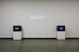 Since the beginning of the 20th century, art has often sought to combine art and language, and aspired to show how writing becomes image. In addition, art has revealed a primary interest in language as something that resists algorithmic exploitation and simple translatability. In her work, Finalmente solo, finalmente tutti (2013), Elisabetta Benassi uses a language that is aligned with a sequence of codes, but is neither written nor spoken: Two Morse-code signal lamps are positioned facing each other in a dark room. They send signals to each other by alternately flaring up and dimming out in a rhythm that can be deciphered as a sequence of letters. The text that is communicated in this way was written by Mario Merz and lifted from his book, Voglio fare subito un libro (I want to make a book right now).
