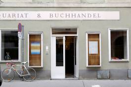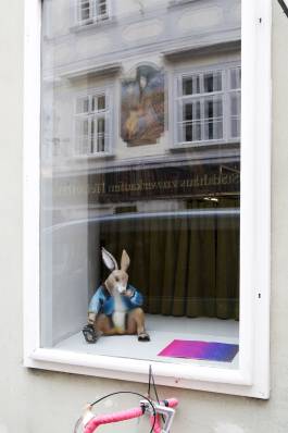The Antiquariat Georg Fritsch however provides a perfect structure that connects with Olaf Nicolai’s interests in experimental literature and the book as a medium. Nicolai stages an intervention inside the bookshop and the window display, centred around the seminal manifesto Eight Point Proclamation of the Poetic Act written in 1953 by H.C. Artmann.
