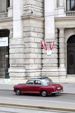 In 1967 Helene Weigel – actress and wife of Bertolt Brecht – bought a Mercedes-Benz Ponton as Director of the Berliner Ensemble and registered it as a company car. The original vehicle has now been rediscovered and made roadworthy. The Mercedes-Benz Ponton is not a marketing tool or “gag,” but is understood as a venue or actor in public space. The car is a particularly auratic fetish site/space/object. One can almost smell the story that happened in and around the car – especially given the acquisition of the car after the Berlin Wall was built by the GDR. It was literally about a borderline situation of consumption. The car was transported to Vienna and parked in a prominent place near the Viennese Burgtheater and Volkstheater – a kind of return of the Austrian Helene Weigel – recalling the Vienna “Brecht Boycott” (1953–1963), which ended with a performance in 1962/63 at the Volkstheater.