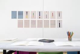 At ZOOM Children’s Museum Olaf Nicolai realizes a workshop for kids based on the piece A Coloring book for children after motifs by Arnulf Rainer (2002) which is on view. Drawings and collages from a portfolio of Rainer [Proportionsordnungen, 1954] were used to provide templates to be painted out or painted over in the children’s drawing book.