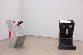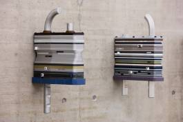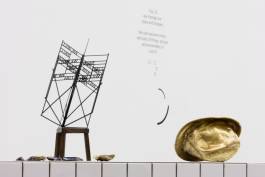 Magali Reus’ padlocks sculptures from the Leaves series, in turn, play with the aura of technology in that they remind us of complex technological apparatuses. Equipped with sprockets, metal pipes and valves, they seem to measure and process data while the actual determination of the object lies in the imagination of the beholder. Unlike technological devices, they exhibit their interiors and the precise way they are built as a stratification of various materials and textures. Still, these sculptures thus remain just as fascinating as incomprehensible.